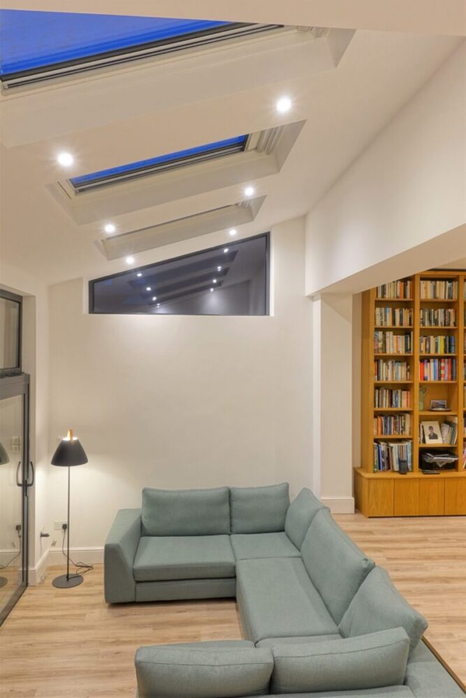 The solution was a split-level design, with the sofa area 60 cm lower, so it was closer to the garden, with the deck becoming a natural extension of the living area, viewed through the full height patio doors. Magda is particularly pleased with the way the clerestory windows above and Velux roof lights allow light to flood the once dark kitchen and dining room, and that as the change in level conformed to Building Regulations requirements, no balustrade was required.